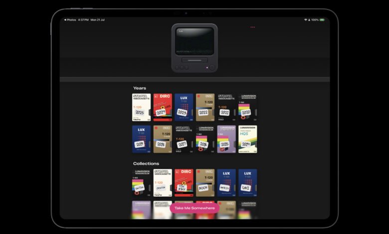 After opening the app, you’ll see each available year as a VHS cassette with a sticky note. Select a year, and a random video from the year will start playing on a retro TV screen and VCR