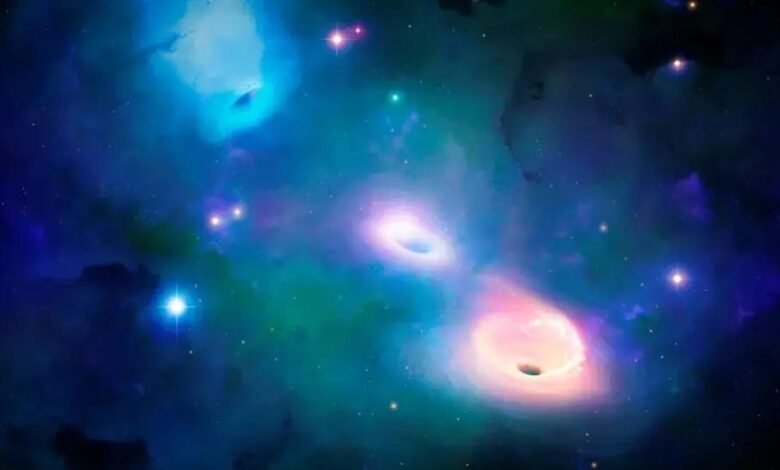 When multiple black holes appear in the same vicinity as one another, they will interact with their environment via dynamical friction. As the matter gets either swallowed or expelled, the black holes become more tightly gravitationally bound. If the black holes are of unequal masses, the smaller one will lose more orbital energy than the larger one, and when they approach each other closely enough, their orbits will decay via the emission of gravitational waves before ultimately leading to a merger. (Credit: Mark Garlick/SPL)