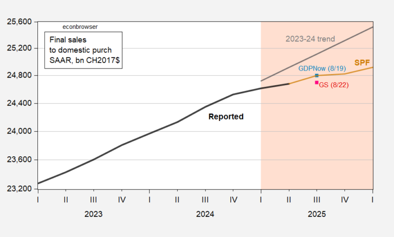 Figure 1: Final sales to domestic purchasers (bold black), August Survey of Professional Forecasters median (brown), 2023-24 stochastic trend (gray), and GDPNow of 8/19 (light blue square), and Goldman Sachs of 8/22 (red square), all in bn.Ch.2017$ SAAR. Source: BEA, Atlanta Fed, Goldman Sachs, and author’s calculations.