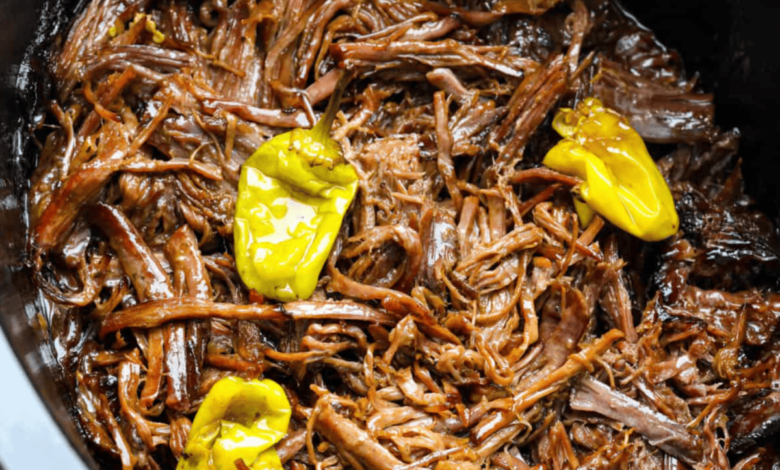 Place 3-4 pounds chuck roast in the bottom of the slow cooker. Sprinkle 1 (1-ounce) packet ranch seasoning and 1 (1-ounce) packet au jus gravy mix on top of the roast. Top with ¼ cup butter and 8-10 pepperoncini peppers.
