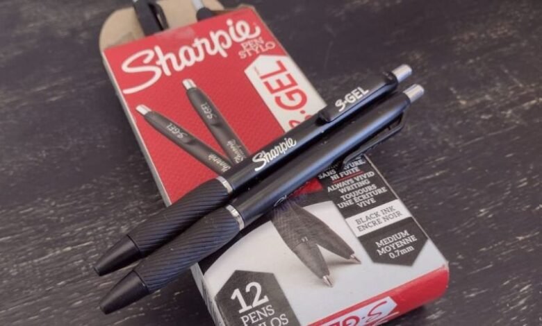 a box of Sharpie S-Gel Pens with 2 pens set on top of it